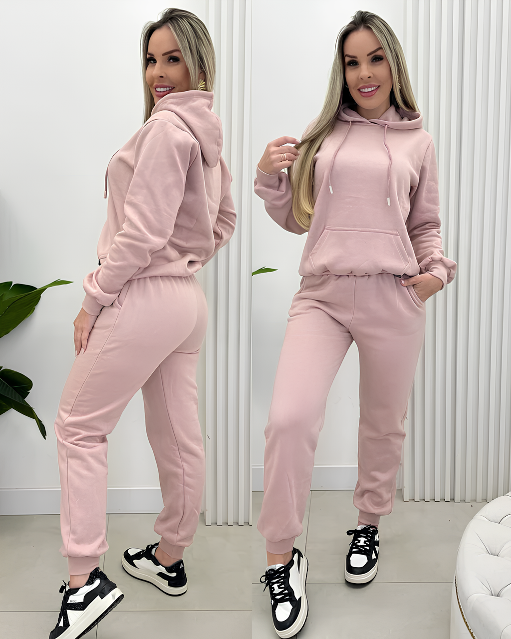 O Conjunto Thay é composto por uma calça e uma blusa de moletom, proporcionando conforto e estilo. A calça modelo jogger não possui forro, conta com elástico na cintura e bolsos frontais. A blusa de moletom de manga longa possui capuz, punhos nas mangas e bolsos na parte da frente. Feito em tecido de moletom, é ideal para dias mais frios.