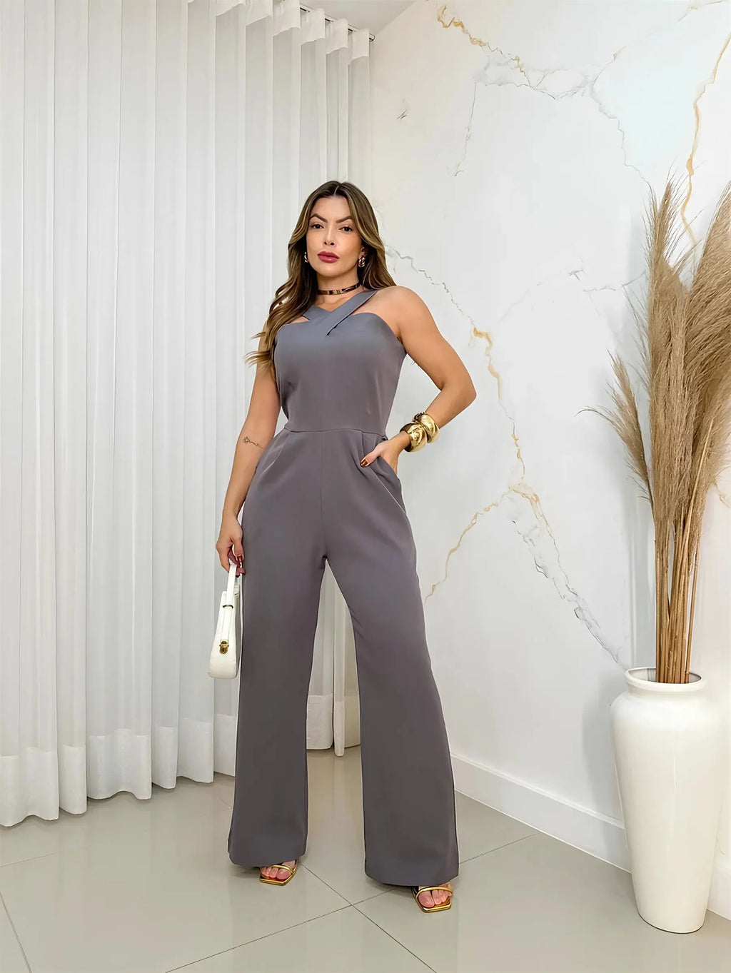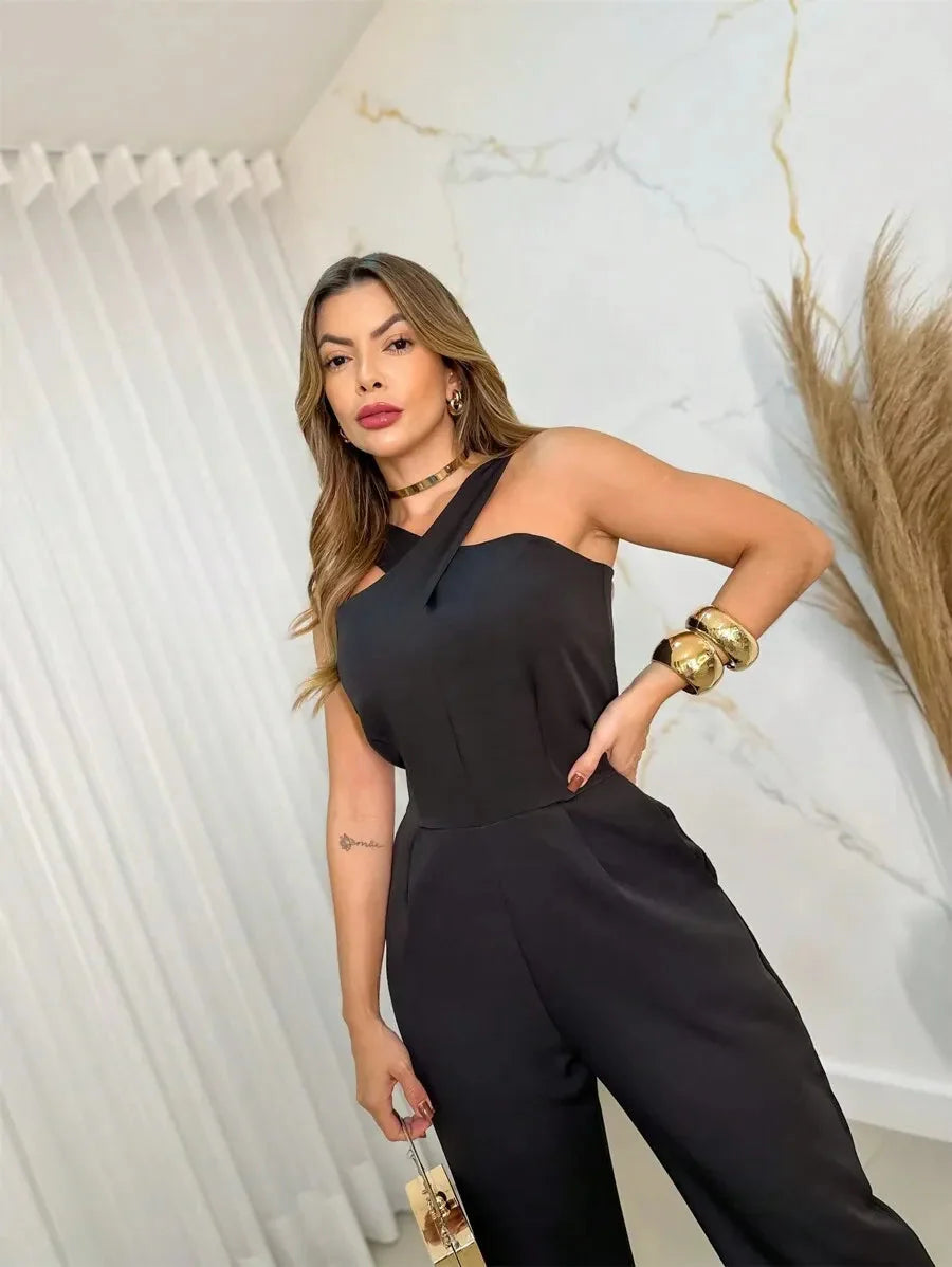 Apresentamos o Macacão Keyla de Alfaiataria Elegante, uma peça sofisticada e versátil. Com estampa simples, sem mangas e cintura alta, oferece um ajuste regular e comprimento longo, ideal para diversas ocasiões elegantes.