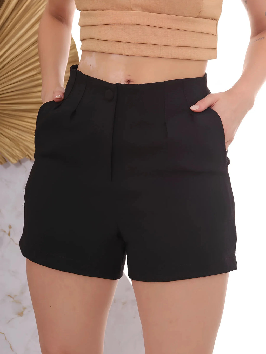 Apresentamos o Short Késia de Linho Elegance, ideal para um estilo casual e sofisticado. Com cintura alta e ajuste regular, possui fechamento por botão e zíper, além de bolsos simples. Feito de linho não elástico, recomenda-se lavar à mão.