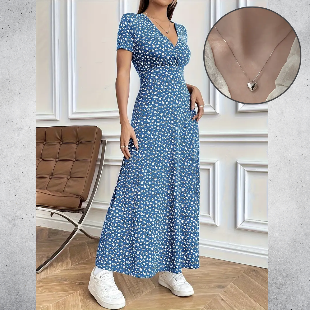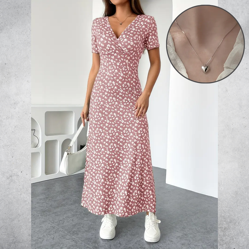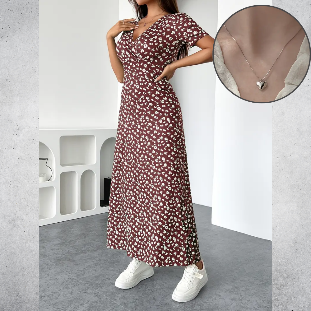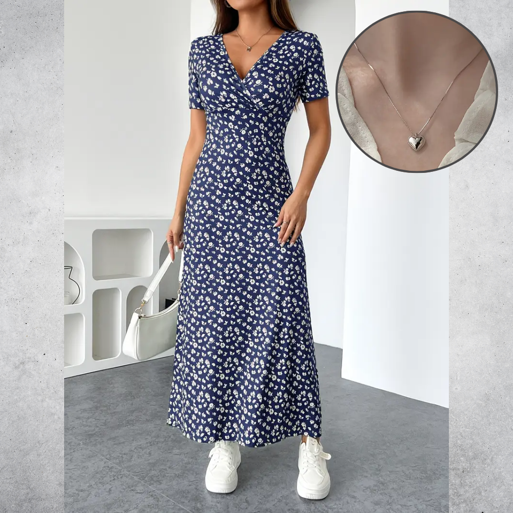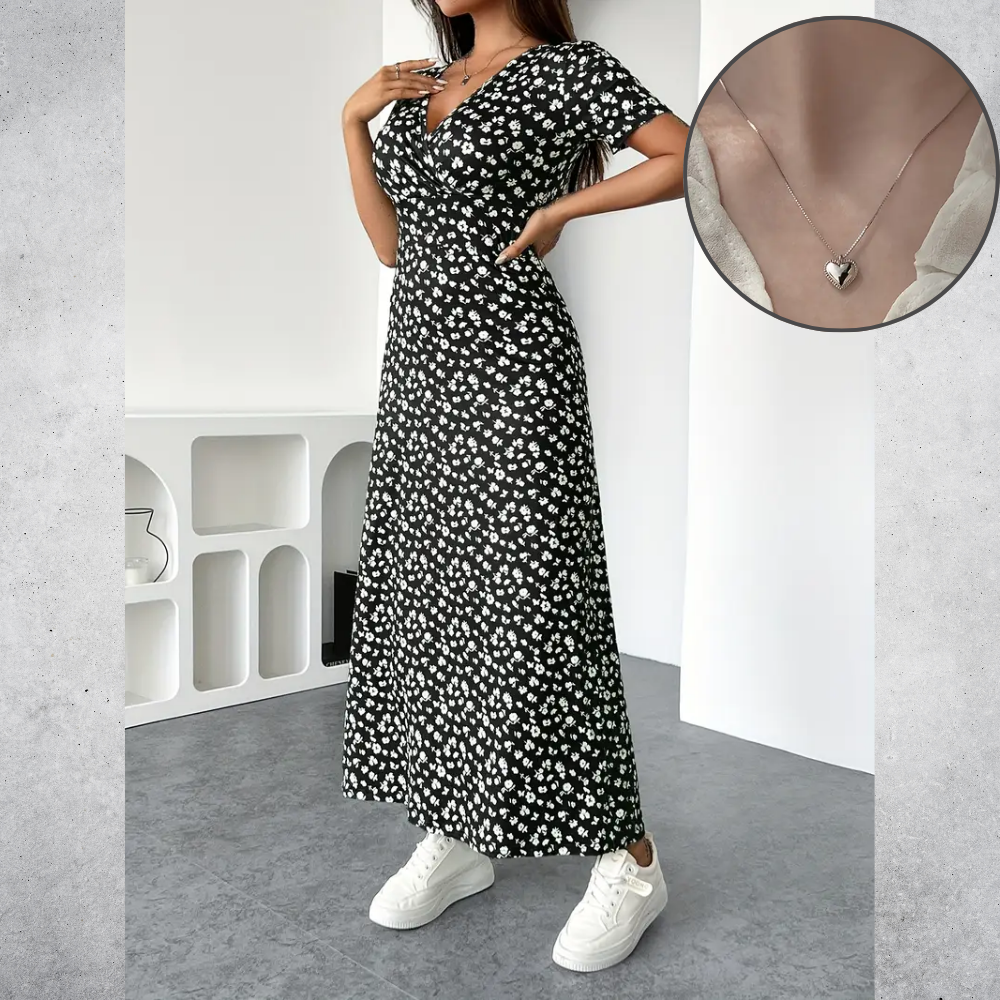 Vestido Floral Decote V Feminino - Dália + Colar de Brinde